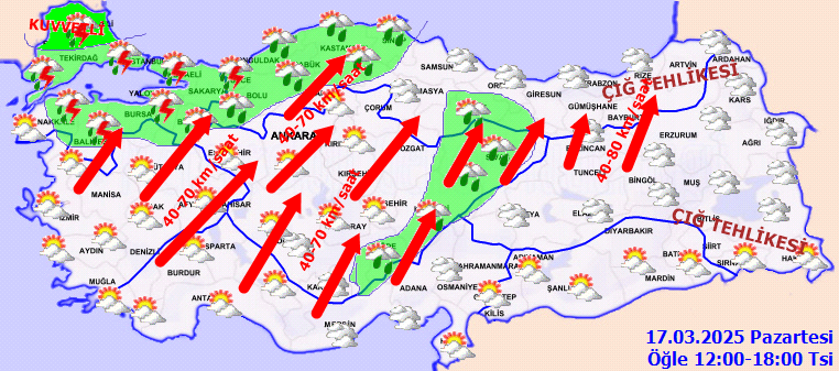 GÜÇLÜ KÜLƏK XƏBƏRDARLIĞI: Egey, Qərbi Aralıq dənizi və Mərkəzi və Şərqi Qara dəniz, Şərqi Anadolunun qərbi, İç Anadolu və Mərmərə bölgələrində cənub, yerli olaraq güclü (40-70 km/saat) küləyin əsəcəyi gözlənildiyi üçün diqqətli olmaq və baş verə biləcək mənfiliklərə qarşı tədbir görmək lazımdır.